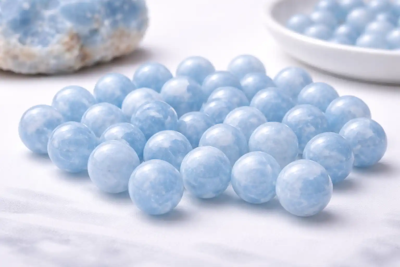 For buyers comparing blue calcite vs celestite, the quickest difference is “habit and feel.” Blue calcite is often sold as opaque-to-translucent masses, tumbled stones, carvings, and bracelets, with white streaking and a softer, waxy look. Celestite is more commonly seen as sparkling crystal clusters and geodes, often more glassy and crystalline. In merchandising, Blue Calcite Benefits lean toward calm communication themes, while celestite is usually positioned as “airy, uplifting.” When in doubt, request batch videos—the benefits of blue calcite sell best when your labels match the actual look.